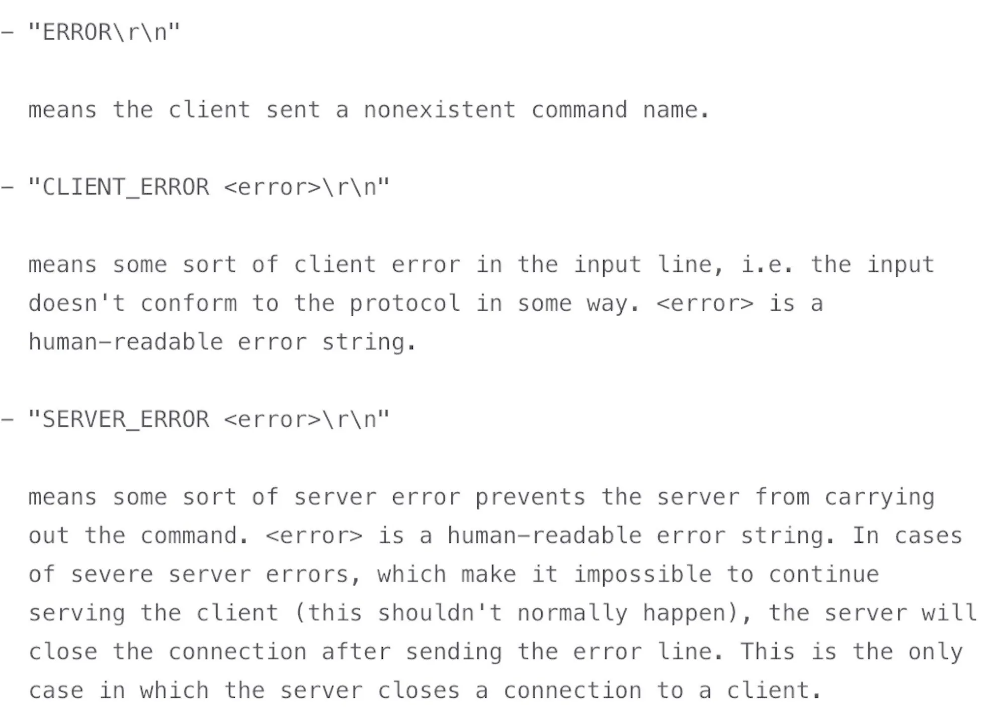 下图出自 memcached 的文档,描述了出错的时候,应该返回什么内容和具体的格式